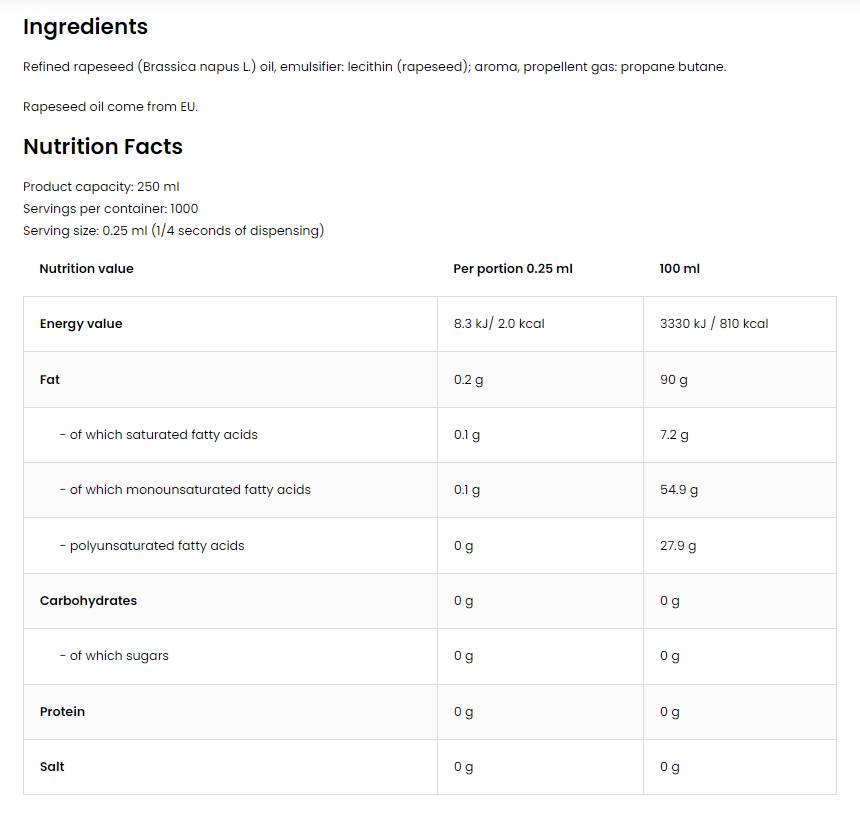 Olej na varenie v spreji je inovatívny produkt, vďaka ktorému je varenie jednoduchšie a praktickejšie. S ním môžete znížiť množstvo použitého oleja, čo je užitočné najmä pre ľudí, ktorí chcú kontrolovať príjem kalórií. Tento sprej zabraňuje prilepeniu jedla, vďaka čomu je ideálny na prípravu rôznych jedál – od pečenej zeleniny až po vyprážané vajíčka.
