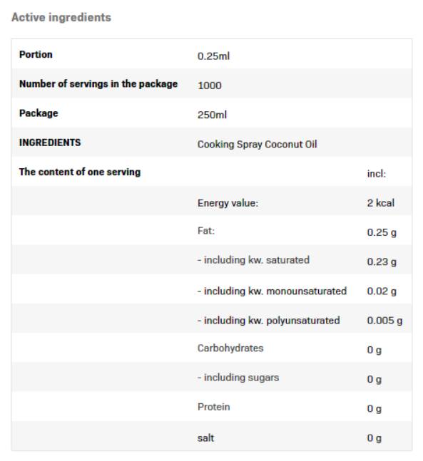 Tento sprej na varenie s kokosovým olejom je dokonalou alternatívou k tradičným tukom. S ním môžete variť s minimálnym množstvom kalórií, bez kompromisov v chuti. Je ideálny na pečenie a vyprážanie a dodáva vašim pokrmom charakteristickú tropickú príchuť kokosu. Výrobok neobsahuje trans-tuky, vďaka čomu je zdravou voľbou pre vašu diétu.