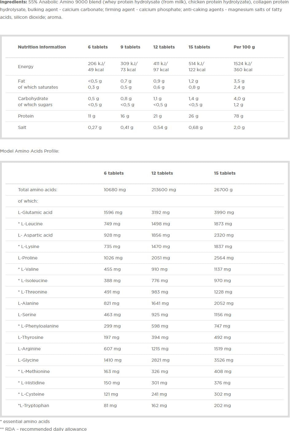 Základom Anabolic amino 9000 ® sú di- a tripeptidy a významný podiel voľných aminokyselín, čo zaručuje rýchle nasýtenie organizmu potrebnými aminokyselinami a udržanie anabolického stavu po dobu jednej hodiny od podania. Dva zdroje bielkovín zaručujú udržanie pozitívnej dusíkovej bilancie v tele aj pri najintenzívnejšom tréningu. Hydrolyzátové formy zaisťujú dosiahnutie vysokej koncentrácie rozvetvených aminokyselín (l-leucín, l-valín, l-izoleucín), ktoré sú mimoriadne účinné proti svalovému katabolizmu.