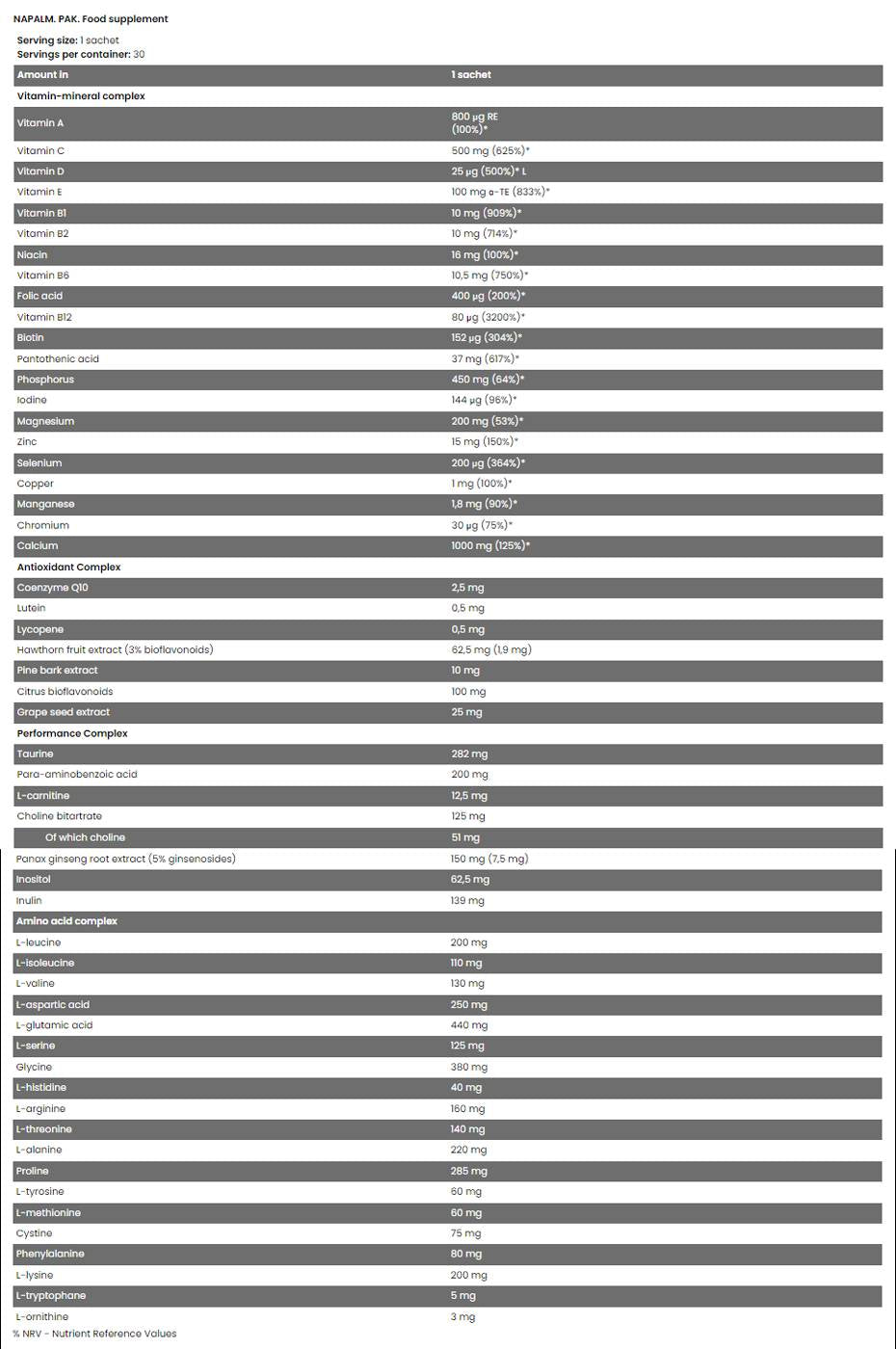 Xtreme Napalm Pak poskytuje kompletnú receptúru vitamínov, minerálov a antioxidantov od FA Nutrition je vysoko špecializovaný multivitamín, ktorý obsahuje vybrané vitamíny a minerály potrebné na udržanie dôležitých funkcií ľudského tela počas dňa. Primárne je určený pre ľudí, ktorí potrebujú fyzickú a duševnú aktivitu. Podporuje základné funkcie metabolizmu, fyzickú a psychickú výkonnosť, predchádza únave a urýchľuje regeneráciu po tréningu.