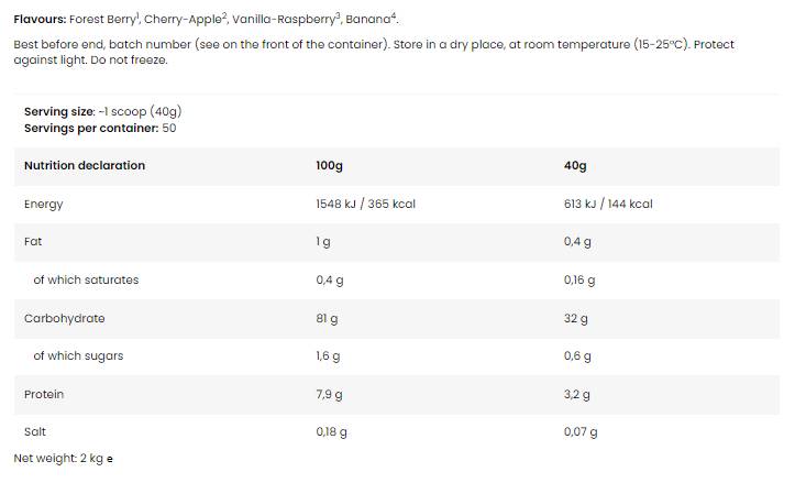 *Sacharidy prispievajú k obnove normálnej funkcie svalov (kontrakcie) po vysokointenzívnom a/alebo dlhotrvajúcom fyzickom cvičení, ktoré vedie k svalovej únave a vyčerpaniu zásob glykogénu v kostrových svaloch. Priaznivý účinok sa dosiahne pri konzumácii sacharidov zo všetkých zdrojov v celkovom príjme 4 g na kg telesnej hmotnosti v dávkach počas prvých 4 hodín a najneskôr do 6 hodín po vysokointenzívnom a/alebo dlhotrvajúcom fyzickom cvičení vedúcom k svalovej únave a vyčerpaniu zásob glykogénu v kostrových svaloch.