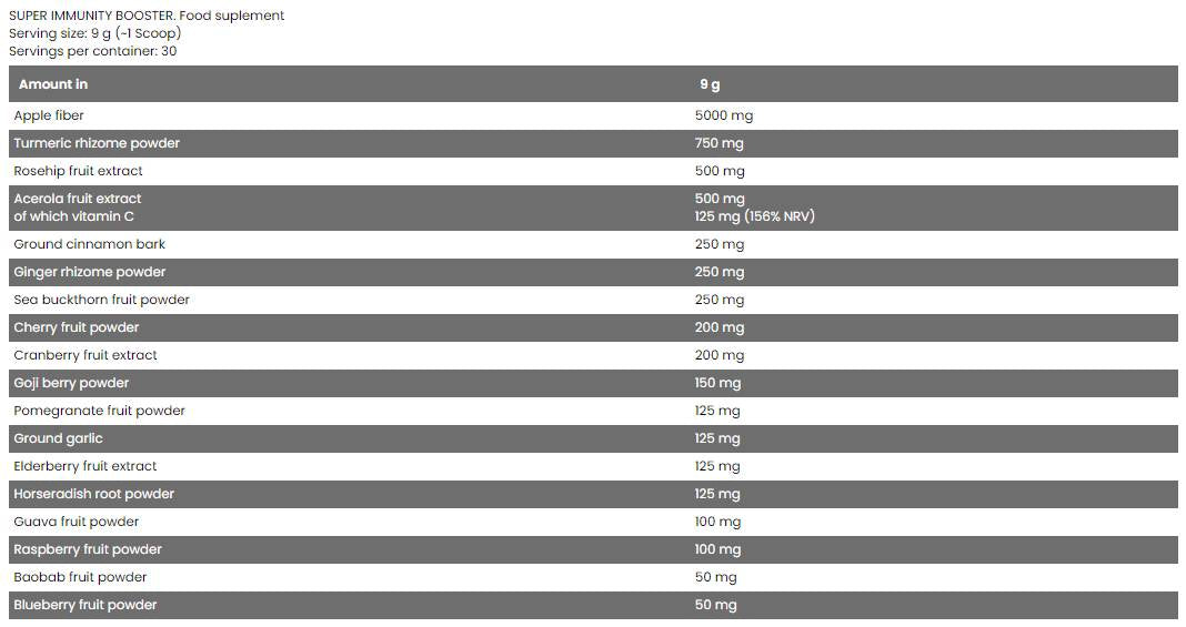 Zloženie FA SUPER IMUNITY Booster je precízne pripravená kompozícia z vlákniny, zeleniny, ovocia a korenín, ktoré sú všeobecne známe svojim cenným vplyvom na imunitu. Zložky použité v prípravku sú prírodnými zdrojmi cenných účinných látok (ako je vitamín C a polyfenoly) s pozitívnym vplyvom na stav a fungovanie metabolizmu. Receptúra ​​produktu je úplne bez farbív, cukru a akýchkoľvek živočíšnych prísad - doplnok je priateľský pre vegánov a vegetariánov. Receptúra ​​je dostupná ako ľahko rozpustný prášok bez chuti, ktorý možno použiť ako doplnok k iným prípravkom.