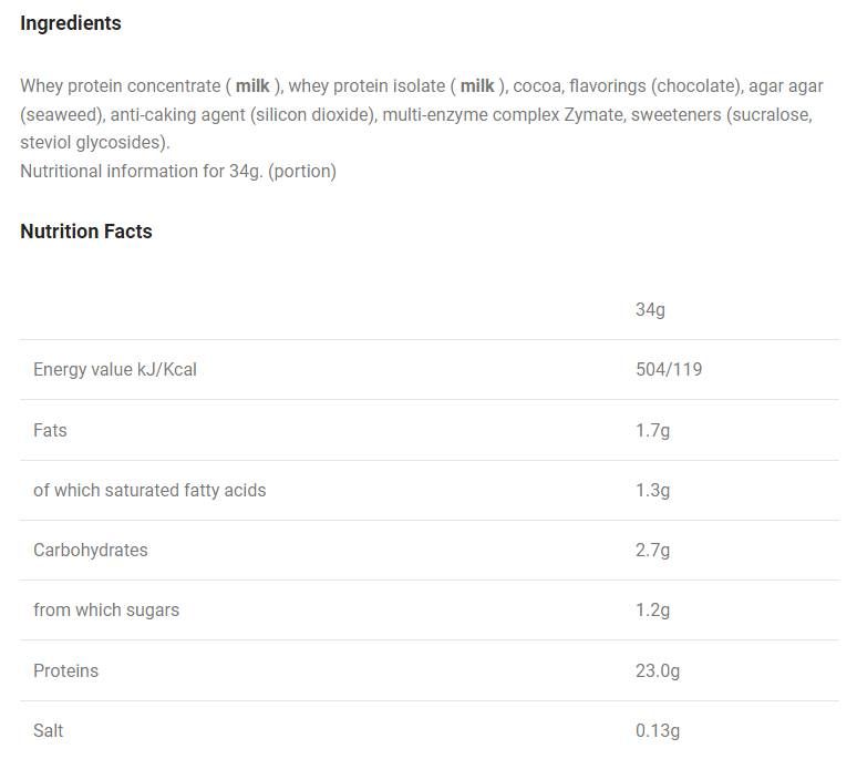Srvátkový proteínový koncentrát ( mlieko ), srvátkový proteínový izolát ( mlieko ), agar agar (morské riasy), protihrudkujúca látka (oxid kremičitý), arómy (vanilka), multienzýmový komplex Zymate, sladidlá (sukralóza, steviol-glykozidy), farbivá (beta karotén).