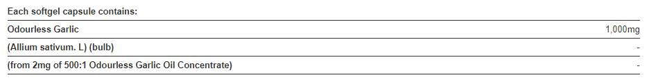Cesnak bez zápachu 1000 mg je doplnok stravy s cesnakovým extraktom a je bez zápachu. Cesnak má vďaka látke alicín antibakteriálne a protiplesňové účinky. Alicín je látka, ktorá určuje štipľavý zápach cesnaku. Keď sa naruší integrita klinčeka, aktivuje sa enzým aliináza, ktorý premení predtým bez zápachu aliín na alicín. Častice tejto látky sa zúčastňujú reakcií s červenými krvinkami (erytrocyty). Touto reakciou vzniká sírovodík. Vyznačuje sa nenávisťousant zápach, ale hrá dôležitú úlohu v interakcii medzi bunkami. Znižuje napätie stien erytrocytov a buniek, ktoré tvoria cievy. Cesnak tak nepriamo zlepšuje krvný obeh, čo vedie k zníženiu krvného tlaku.