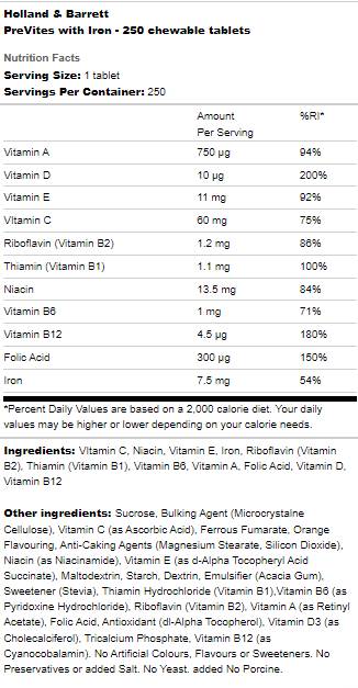 Holland & Barrett PreVites so železom | Chewable je lahodná multivitamínová žuvačka s príchuťou pomaranča a železa. Zloženie je špeciálne navrhnuté pre aktívne rastúce deti vo veku od 3 rokov a obsahuje vitamíny A, D, E a C spolu s ďalšími vitamínmi a minerálmi. Prídavok železa pomáha udržiavať niekoľko dôležitých funkcií v rastúcom tele. Železo prispieva k zníženiu únavy a vyčerpania. Prispieva k normálnej funkcii imunitného systému a tiež prispieva k normálnemu kognitívnemu vývoju detí.