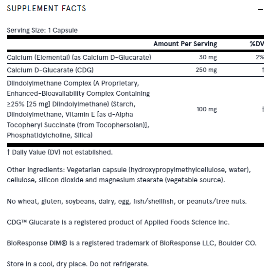 DIM + CDG podporuje viacero detoxikačných ciest zapojených do zdravej hormonálnej regulácie. D-glukarát vápenatý (CDG) podporuje detoxikáciu prostredníctvom glukuronidácie pečene a diindolylmetán (DIM) podporuje detoxikáciu prostredníctvom 2-hydroxylácie pečene. Vzorec DIM + CDG podporuje zdravú rovnováhu estrogénu a testosterónu u žien aj mužov.