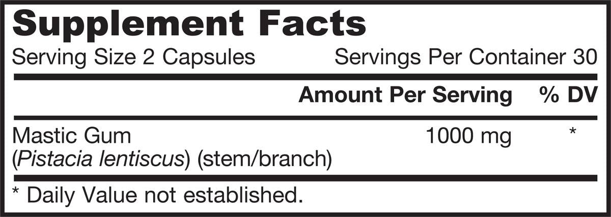 Masticha guma je prírodný produkt, ktorý sa používa už viac ako 2500 rokov na podporu zdravia čriev, žalúdka a pečene. Avšak až v polovici osemdesiatych rokov vedci potvrdili účinnosť mastichovej gumy pri podpore buniek a tkanív žalúdka a dvanástnika. Zistilo sa, že užívanie jedného gramu denne je bezpečné a účinné pri podpore zdravia žalúdka. Vedci sa okrem antioxidačných vlastností domnievajú, že mastichová guma je prospešná pri vyrovnávaní sekrécie žalúdka.