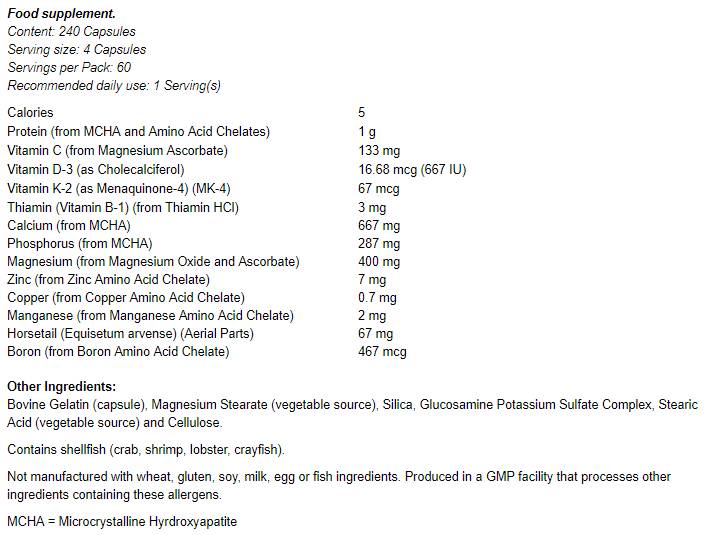 Sila kostí NOW® obsahuje mikrokryštalické Hydroxyapatit (MCHA) – čisto prírodná zložka, ktorá buduje kryštalickú štruktúru kostí a zubov. MCHA je zdrojom vysoko vstrebateľných minerálov Vápnik a Fosfor, ktoré sú hlavnými stavebnými prvkami kostí. NOW® Bone Strength™ obsahuje stopové prvky a vitamíny C, D a K, ktoré sa podieľajú na procesoch budovania a obnovy kostného tkaniva.
