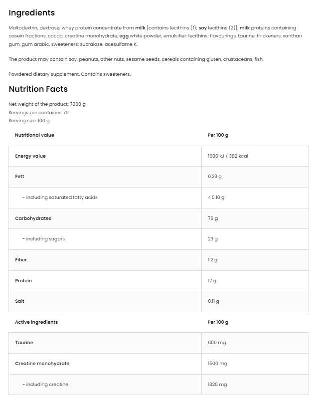 Anabolic Gainer je silná formula určená pre ľudí, ktorí chcú zvýšiť svoju svalovú hmotu a zlepšiť svoj výkon počas tréningu. Jeho zloženie obsahuje kreatín a taurín, ktoré sú známe svojimi priaznivými účinkami na fyzickú odolnosť, silu a regeneráciu. Kreatín pomáha zvyšovať svalovú hmotu a zlepšovať športový výkon, zatiaľ čo taurín hrá dôležitú úlohu v energetickom metabolizme a regulácii rovnováhy elektrolytov v tele.