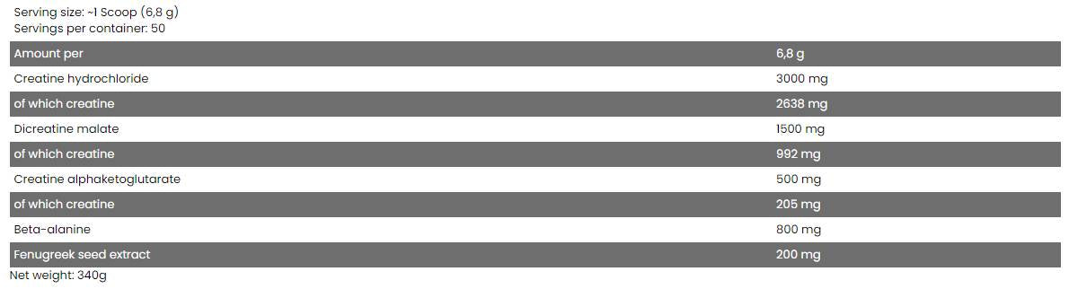 FA Nutrition CORE Crea je kreatínový matrix obsahujúci pokročilé formy kreatínu, vrátane kreatín hydrochloridu ( HCL ). Vzorec je obohatený o beta-alanín v jeho najčistejšej forme - patentovaný CarnoSyn® , ktorý znižuje uvoľňovanie kyseliny mliečnej vo svaloch pri intenzívnom cvičení. Matrica tiež obsahuje extrakt senovky gréckej, ktorej úlohou je zvýšiť citlivosť na inzulín a pomôcť kreatínu dostať sa do svalových buniek. Každá forma kreatínu v CORE Crea sa perfektne dávkuje a zaručuje maximálny účinok pri každom tréningu!