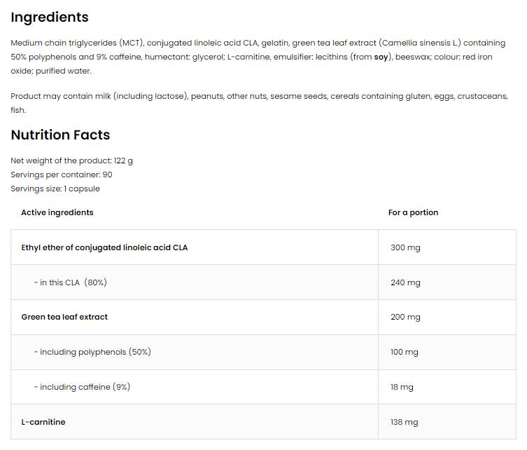 Produkt kombinuje tri silné zložky – CLA, zelený čaj a L-karnitín, ktoré synergicky pôsobia na dosiahnutie optimálnych výsledkov v kontexte chudnutia a zvýšenia energie. CLA (konjugovaná kyselina linolová) je známa svojim účinkom na spaľovanie tukov, zatiaľ čo zelený čaj je prírodný antioxidant, ktorý dokáže zvýšiť metabolizmus a podporiť proces chudnutia. L-karnitín tiež hrá dôležitú úlohu pri transporte tukov do mitochondrií, kde sa premieňajú na energiu.