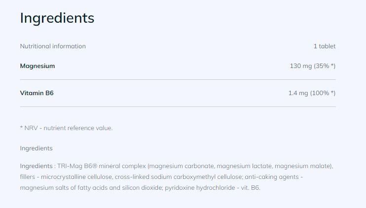Vzorec z Olimp Tri-Mag B6 / 30 tabliet je obohatený o vitamín B6, ktorý je nevyhnutný pre metabolizmus, činnosť nervovej sústavy, zníženie únavy a zvýšenie energie. Synergické pôsobenie týchto zložiek zabraňuje bolestiam a kŕčom, napomáha regenerácii a podporuje dobrú koncentráciu počas silového tréningu.