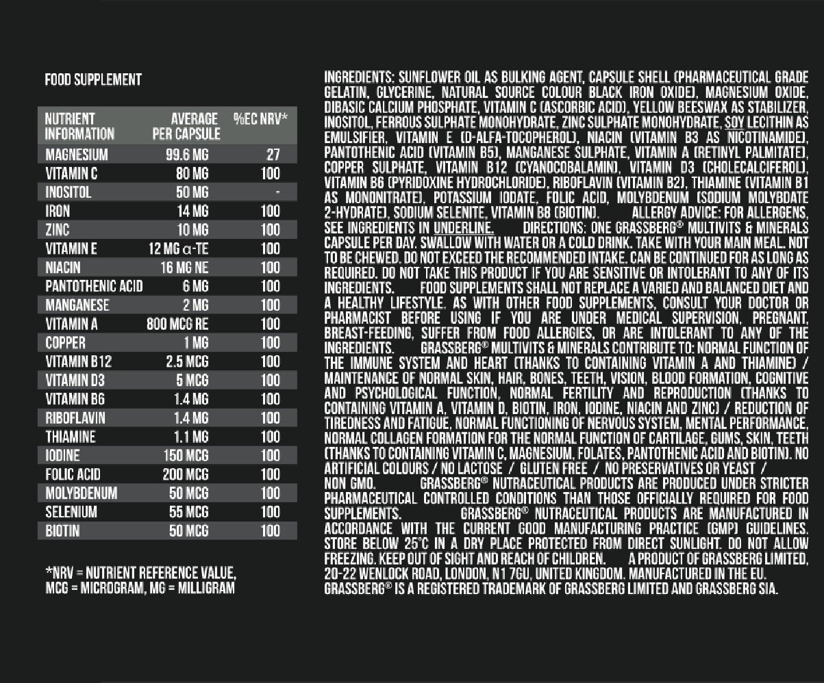 V uponáhľanom životnom štýle a pre ľudí na diéte je často náročné získať potrebné vitamíny a minerály z rôznych potravín. Grassberg Multivits & Minerals vám to umožňuje bez pridávania zbytočných kalórií do stravy, čo by mohlo ohroziť vaše výsledky.