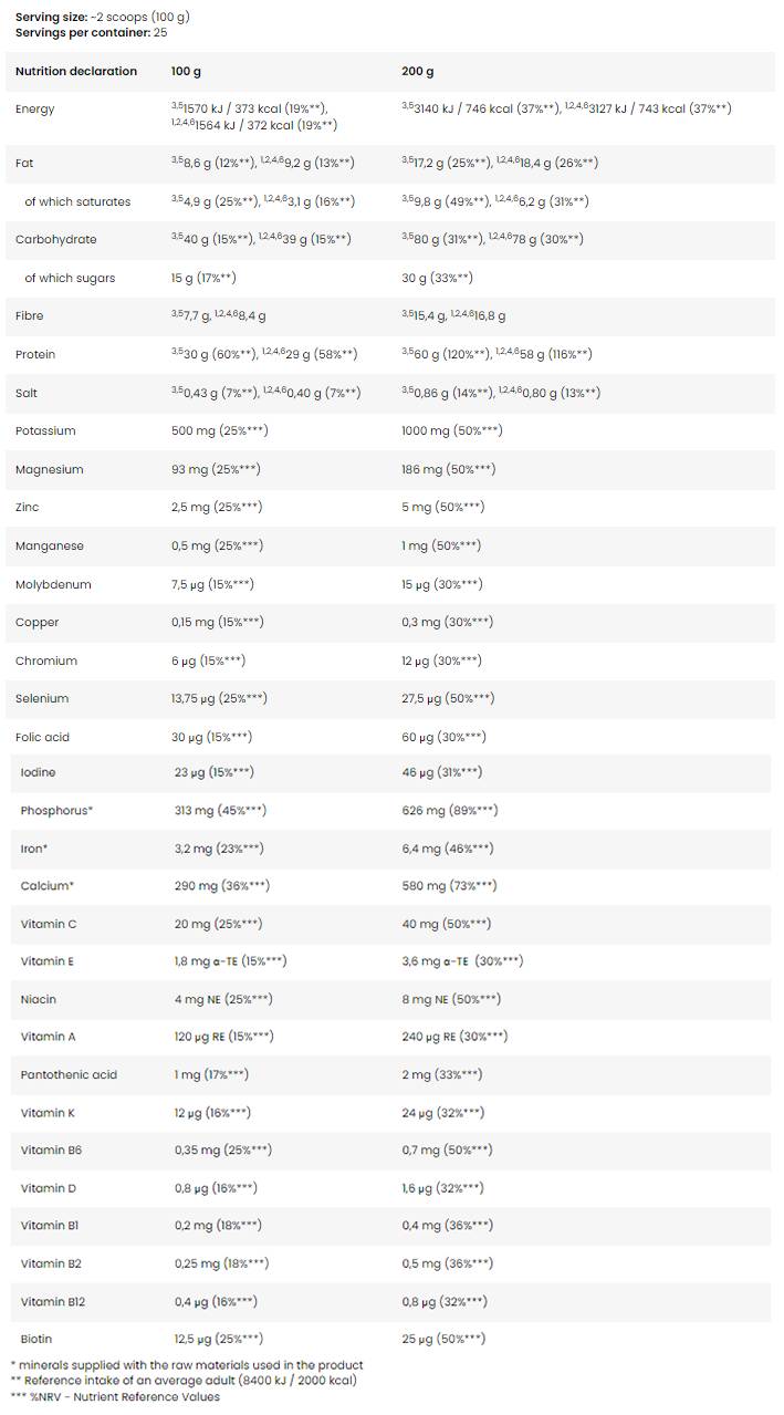 Jedna porcia produktu obsahuje cca 35 gramov bielkovín , ktorý je hlavným prvkom pre regeneráciu a rast svalov.