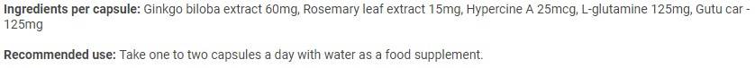 Rozmarín, pridaný do kompozície, je známy svojimi antioxidantmi rozpustnými v tukoch, ktoré pomáhajú neutralizovať voľné radikály v tele. Vďaka tomu je vynikajúcim spojencom na zlepšenie funkcie mozgu. Extrakt z Ginkgo Biloba zlepšuje krvný obeh v mozgovom tkanive, čo vedie k lepšiemu prístupu kyslíka a živín k bunkám. Gotu Kola navyše pomáha zlepšovať krvný obeh v mozgu, ktorý je nevyhnutný pre pamäť a koncentráciu.
