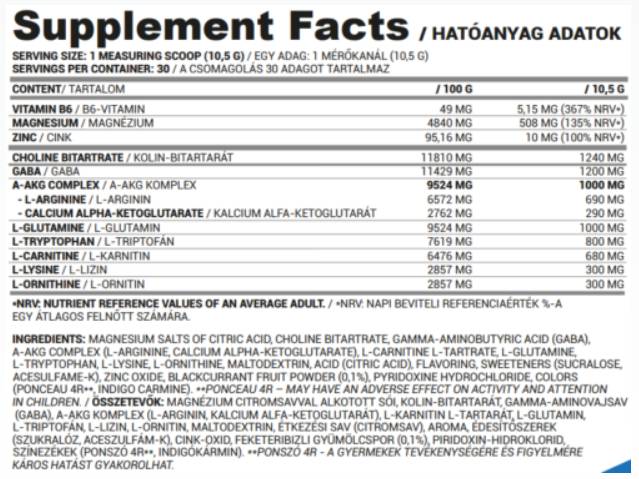 Na jednej strane produkt obsahuje veľké množstvo aminokyseliny GABA a aminokyselina L-tryptofán , ktorý je predchodcom melatonín , hormón spánku, v našom tele. Z aminokyselín obsahuje aj L-glutamín a L-karnitín a je doplnená o dve kombinácie účinných látok, kombináciu o L-lyzín , L-ornitín a cholín a klasické stopové prvky zinok , horčík a B6 .