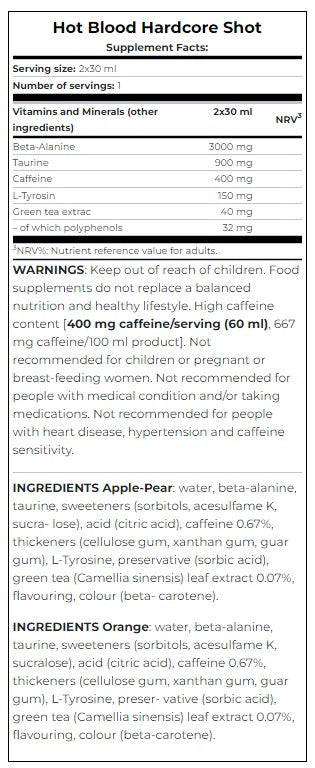 SCITEC Hot Blood Hardcore Shot je silný predtréningový doplnok navrhnutý tak, aby vám pomohol posúvať vaše limity a dosiahnuť nové výšky v posilňovni. Vďaka svojim jedinečným zložkám, vrátane kofeínu a extraktu zo zeleného čaju, tento produkt poskytuje optimálny energetický prísun a antioxidačnú ochranu. Beta-alanín, tyrozín a taurín v zložení tiež zohrávajú dôležitú úlohu pri zvyšovaní sily a energie počas tréningu. Vedecké štúdie ukazujú, že kofeín môže zlepšiť fyzický výkon a zvýšiť intenzitu tréningu. A extrakt zo zeleného čaju je známy svojimi priaznivými vlastnosťami pre metabolizmus a energetickú rovnováhu.