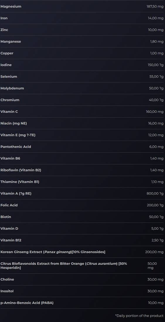 ZLOŽENIE: Esenciálny minerálny komplex [oxid horečnatý; uhličitan horečnatý; fumarát železnatý; maltodextríny; síran zinočnatý; síran manganatý; síran meďnatý; jodid draselný; chlorid chrómový; molybdenan sodný; selenan sodný]; látky zlepšujúce metabolizmus [extrakt z kórejského ženšenu (Panax ginseng) [10 % ginsenosidy]; Citrusový bioflavonoidový extrakt z horkého pomaranča (Citrus aurantium) [50 % hesperidín]; cholín bitartrát; inozitol; kyselina p-aminobenzoová (PABA)]; Vitamínový vzorec [vit. C (kyselina L-askorbová); niacín (nikotínamid); vit. E (DL-alfa-tokoferylacetát); kyselina pantoténová (D-pantotenát vápenatý); vit. B6 (pyridoxín hydrochlorid); riboflavín; tiamín (tiamínmononitrát); vit. A (retinylacetát); kyselina listová (kyselina pteroylmonoglutámová); biotín (D-biotín); vit. D (cholekalciferol); vit. B12 (kyanokobalamín)]; obal kapsuly (želatína; farbivá – oxid titaničitý, oxidy a hydroxidy železa, patentná modrá V); protihrudkujúca látka – horečnaté soli mastných kyselín.