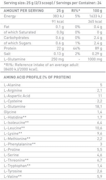 Ingrediencie: Srvátkový proteínový izolát a hydrolyzát, L-Glutamín