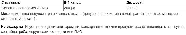 Selén z prírodného zdroja vo forme L-selenometionínu alebo Se-Met – prírodnej aminokyseliny, ktorá sa v porovnaní s inými formami selénu oveľa ľahšie vstrebáva a zostáva v tele dlhšie. Zloženie Selenium (L-selenometionín) je certifikované ISURA, čo zaručuje absenciu GMO, pesticídov, rozpúšťadiel atď.! S certifikátom od GFCO, že neobsahuje lepok. S označením NPN (Natural Product Number) – licencovaný a hodnotený ako bezpečný, účinný a vysoko kvalitný od Health Canada!
