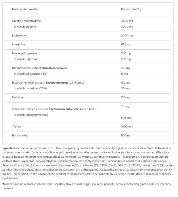 Ingrediencie: kreatín monohydrát, L-citrulín, L-arginín hydrochlorid, taurín, regulátor kyslosti - kyselina citrónová; arómy, beta-alanín, zahusťovadlo - arabská guma (akáciová guma); N-acetyl-L-tyrozín, protihrudkujúca látka - oxid kremičitý; extrakt z koreňa rhodiola rosea (Rhodiola rosea L.), extrakt z bylín bacopa monnieri (Bacopa monnieri (L.) Wettst.), kofeín, sladidlá - acesulfam K, sukralóza; emulgátory - lecitíny (zo sóje), polyoxyetylén sorbitan monooleát (polysorbát 80); schisanVýťažok z ovocia dra chinensis (Schisandra chinensis (Turcz.) Baill.), farby: karotény, karmín, riboflavíny, E 150c, E 150d, E 133, patentná modrá V, indigokarmín, chlorofyly a chlorofylíny, kurkumín, antokyány, extrakt z červenej papriky, betanín, rastlinný uhlík