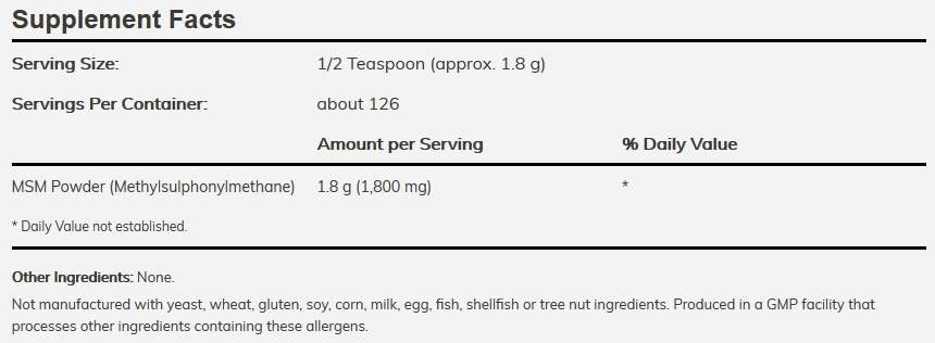 MSM (metylsulfonylmetán) hrá dôležitú úlohu v procese syntézy aminokyselín a kolagénu. Síra je jedným zo základných minerálov, ktorý má v našom tele kľúčovú úlohu. Je ideálny pre tých, ktorí si cenia zdravý vzhľad pokožky, nechtov a vlasov.