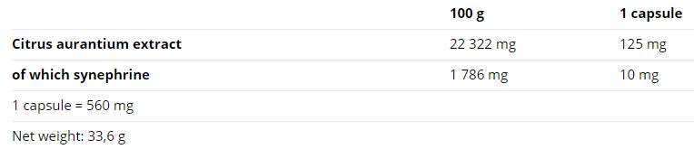 125 mg extraktu z petitgrainového oleja v jednej kapsule – maximálna prípustná denná dávka – 10 mg synefrínu. Stimuluje termogenézu v tele, čím zvyšuje energetický výdaj počas dňa. Pomáha spaľovať tuky, ako pri fyzickej aktivite, tak aj v pokoji.