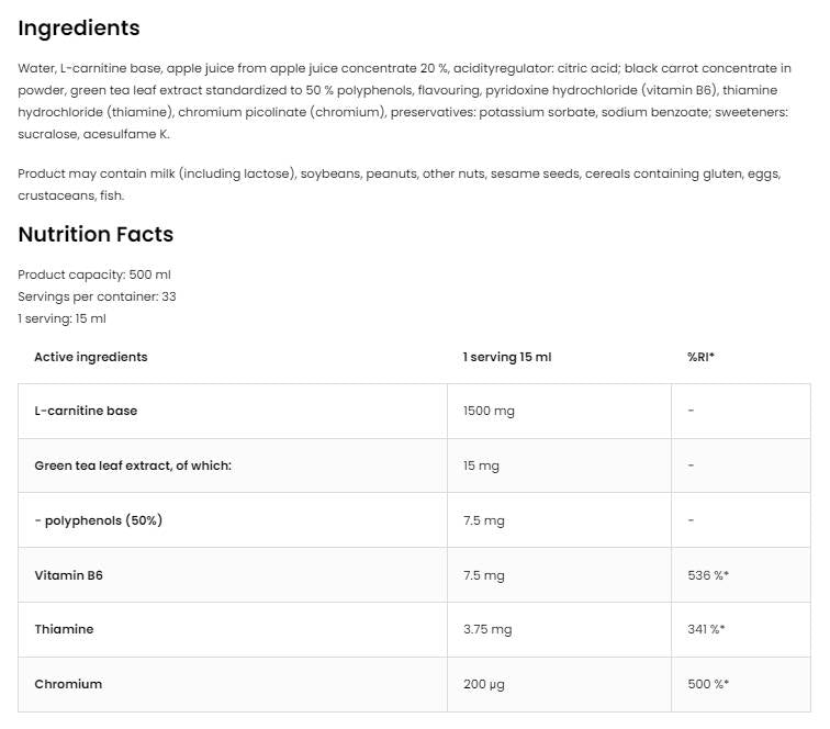 L-Carnitine Liquid je jedinečný produkt, ktorý kombinuje silné vlastnosti L-karnitínu, zeleného čaju a chrómu, aby vám poskytol efektívne riešenie na chudnutie a zlepšenie fyzickej odolnosti. L-karnitín hrá kľúčovú úlohu pri transporte mastných kyselín do mitochondrií, kde sa spaľujú na energiu. Zelený čaj je známy svojimi antioxidačnými vlastnosťami, ktoré pomáhajú bojovať proti voľným radikálom, zatiaľ čo chróm pomáha regulovať hladinu cukru v krvi, čo je obzvlášť dôležité pre kontrolu chuti do jedla. Vedecké výskumy podporujú výhody L-karnitínu a ukazujú, že môže zvýšiť spaľovanie tukov a zlepšiť fyzickú výkonnosť. Zelený čaj sa tiež spája so zvýšeným metabolizmom a úbytkom hmotnosti a chróm môže znížiť chuť do jedla, najmä na sladké látky. Je dôležité poznamenať, že osoby so známymi zdravotnými problémami alebo osoby užívajúce lieky by sa mali pred použitím produktu poradiť s lekárom. Neodporúča sa tehotným a dojčiacim ženám. Pre ten najlepší zážitok z nakupovania ponúka Feel You vynikajúce ceny a kvalitné produkty, ktoré spĺňajú vysoké štandardy bezpečnosti a účinnosti. Nakupujte s dôverou a využite špeciálne ponuky. **Nezabudnite sa pozrieť na druhú fotografiu produktu, kde nájdete úplné zloženie produktu!**