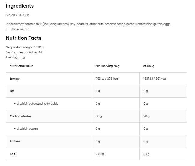 Нишестето, наричано още полизахарид, е основният въглехидрат, намиращ се в зиълурненуну растения, картофи и други грудки и корени. VITARGO е вид въглехидрат, който се извлича именно от нишесте. Те се характеризират с високо молекулно тегло и високи нива на осмоларност. В резултат на това те имат способността бързо да попълват мускулния гликогенано и не лесно смилаема енергия.