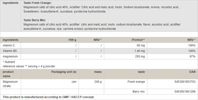 Horčík (citrát horečnatý) je mimoriadne dôležitá pre každú bunku v ľudskom tele. Horčík (citrát horečnatý) je minerál, ktorý je nevyhnutný pre energetický metabolizmus, syntézu bielkovín, prenos nervových vzruchov cez nervovosvalové synapsie a väzbu vápnika na zuby.