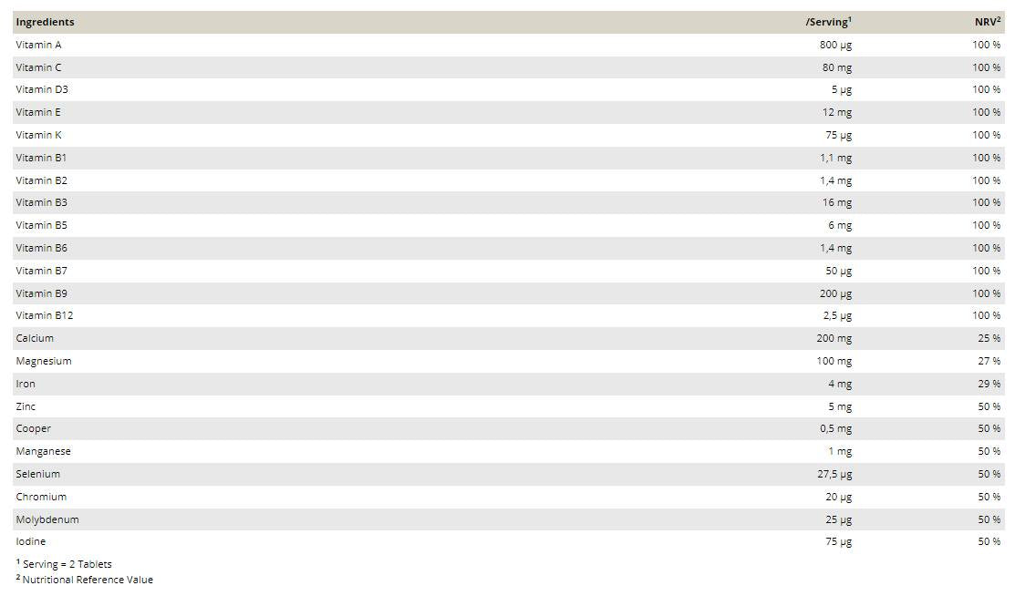 Každá tableta VITAMIN AZ vám poskytne kombináciu 28 základných vitamínov, minerálov a stopových prvkov pre vaše telo. Tablety sú „time-release“, tj dostávajú sa do tela rovnomerne v priebehu niekoľkých hodín a optimálne sa vstrebávajú alebo využívajú.