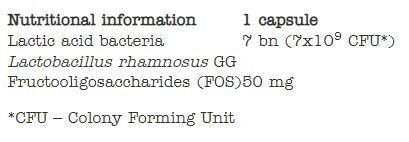 Ingrediencie: maltodextrín, fruktooligosacharidy, Lactobacillus rhamnosus GG (ATCC 53103), zložky obalu kapsuly (leštiaca látka - hydroxypropylmetylcelulóza, stabilizátor - guma gellan, farbivo - oxid titaničitý).