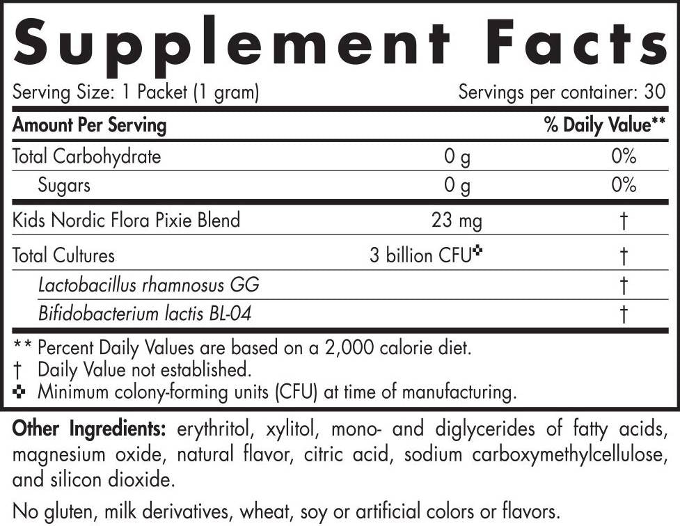 Nordic Flora Kids Probiotic Pixies | 3 Billion Active Cells je zábavný probiotický prášok s príchuťou bobúľ pre zdravie trávenia, imunity a dýchania.