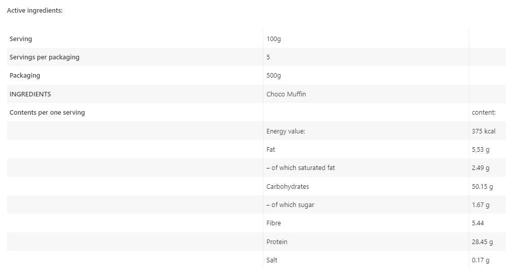 Čokoládový muffin s vysokým obsahom bielkovín je ideálnou voľbou pre každého, kto chce lahodným spôsobom zvýšiť svoj denný príjem bielkovín. Tento produkt je ideálny ako pre aktívnych športovcov, tak aj pre ľudí, ktorí chcú jednoducho zostať fit a zdraví. Vysoký obsah bielkovín pomáha budovať svalovú hmotu a napomáha regenerácii po cvičení a zároveň ponúka potešenie z čokoládovej chuti.