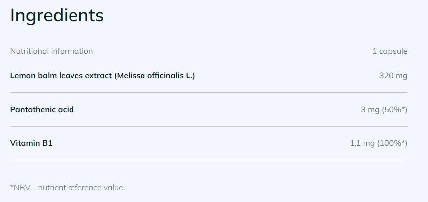 Ingrediencie: extrakt z listov medovky lekárskej (Melissa officinalis L.), plnivo – mikrokryštalická celulóza; protihrudkujúce látky – horečnaté soli mastných kyselín, oxid kremičitý; pantotenát vápenatý – kyselina pantoténová, tiamín hydrochlorid – vitamín B1, kapsula (zložka obalu – želatína, potravinárske farbivo – E 171)