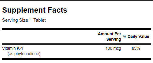 Swanson Vitamín K-1 je bezpečný spôsob, ako dodať telu túto životne dôležitú živinu. Vitamín K-1 podporuje zdravie kostí a krvi. Každá tableta dodáva 100 mcg vitamínu K-1.