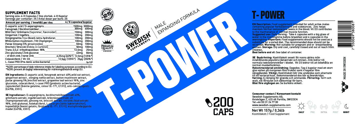 Swedish Supplements T-Power je nabitý množstvom DAA (kyselina D-asparágová) , o ktorom je známe, že účinne zvyšuje hladiny testosterónu v tele. Porcia z T-Power ponúka 3000 mg DAA !