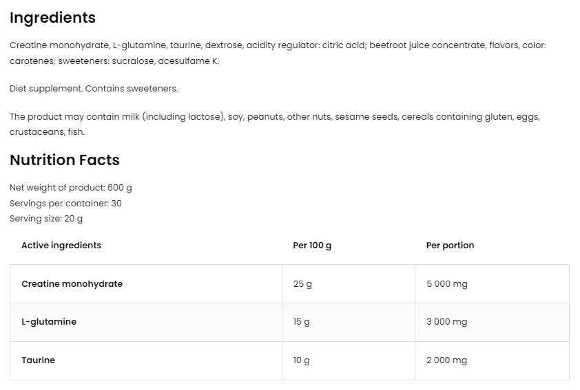 Vedecké štúdie ukázali, že kombinované pôsobenie týchto zložiek môže viesť k výraznému zlepšeniu športového výkonu a fyzickej regenerácie. Napríklad kreatín je spojený so zvýšenou silou a veľkosťou svalov, zatiaľ čo glutamín pôsobí ako primárny zdroj energie pre svalové bunky, najmä po intenzívnom tréningu. Taurín je známy svojimi antioxidačnými vlastnosťami a schopnosťou zlepšiť celkovú fyzickú výkonnosť.