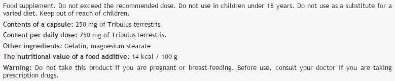 POZOR: Neužívajte Tribulus Terrestris, ak ste tehotná alebo dojčíte. Ak užívate lieky na predpis, poraďte sa s lekárom. Neprekračujte odporúčané dávkovanie a nepoužívajte u detí do 18 rokov.