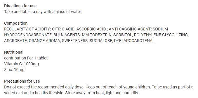 • Vysoká dávka vitamínu C: Každá tableta obsahuje 1000 mg vitamínu C, ktorý je známy svojimi antioxidačnými vlastnosťami a schopnosťou posilňovať imunitný systém.