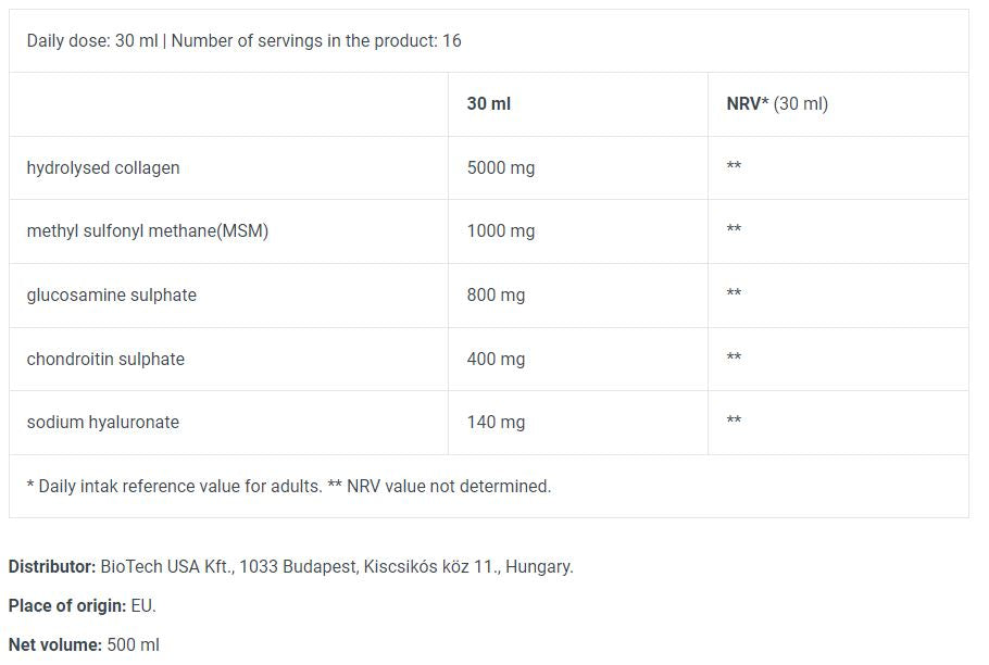 BioTech USA Arthro Forte Liquid / 500 ml je vysoko kvalitný doplnok stravy, ktorý obsahuje komplex účinných látok určených na udržanie zdravia kĺbov, šliach a chrupaviek. Tento produkt je navrhnutý tak, aby posilnil regeneračné procesy, zmiernil bolesť a vykazoval silný protizápalový účinok.