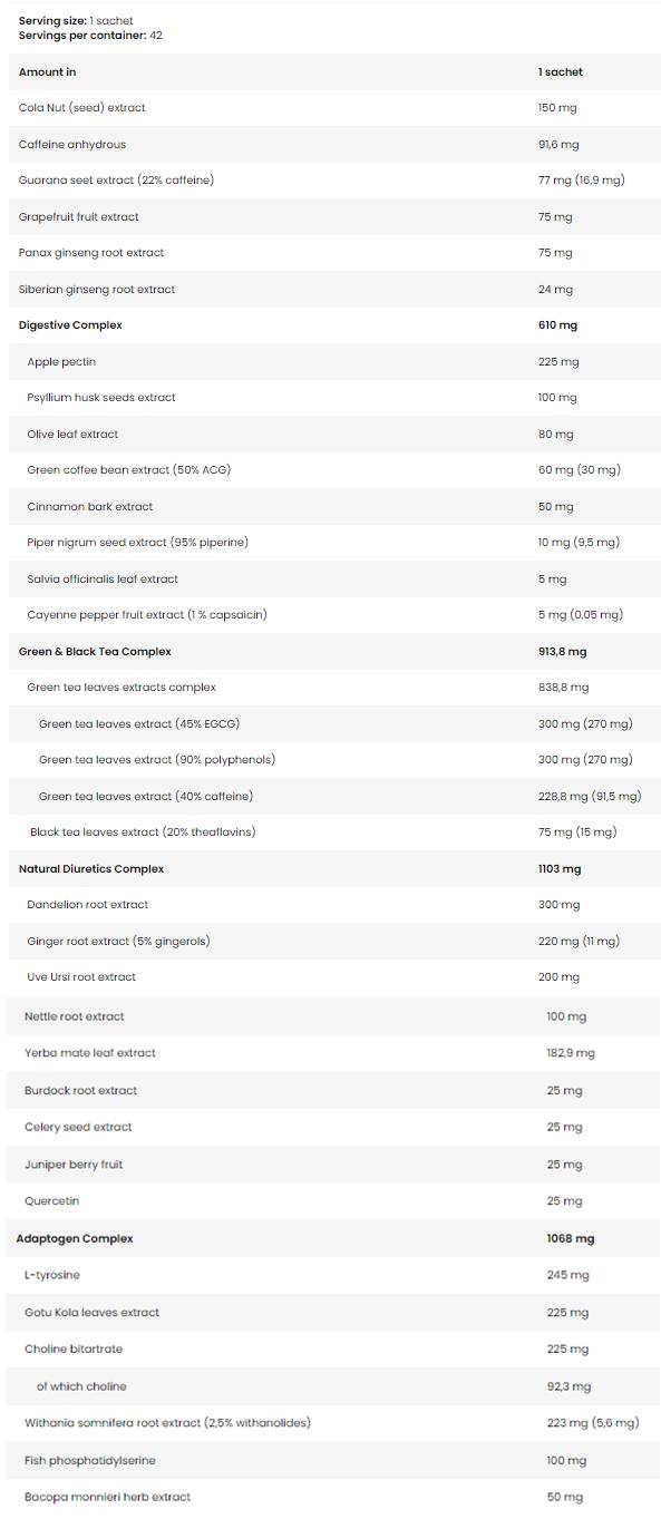 • Extrakt zo zeleného čaju : pomáha udržiavať zvýšenú hladinu norepinefrínu, čo je prospešné pre spaľovanie tukov.