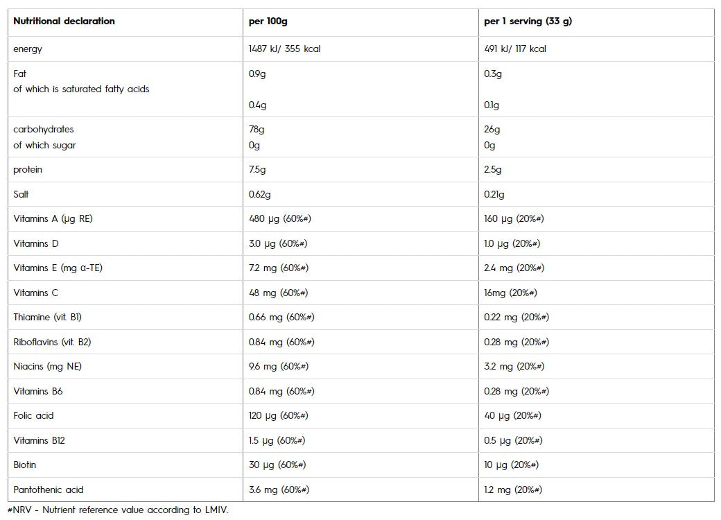 Ingrediencie: 93,5 % ryžová múka, 5 % nízkotučné kakao, sladidlá acesulfam K, sukralóza; vitamíny C, E, niacín, A, B12, D, B6, B2, B1, biotín.
