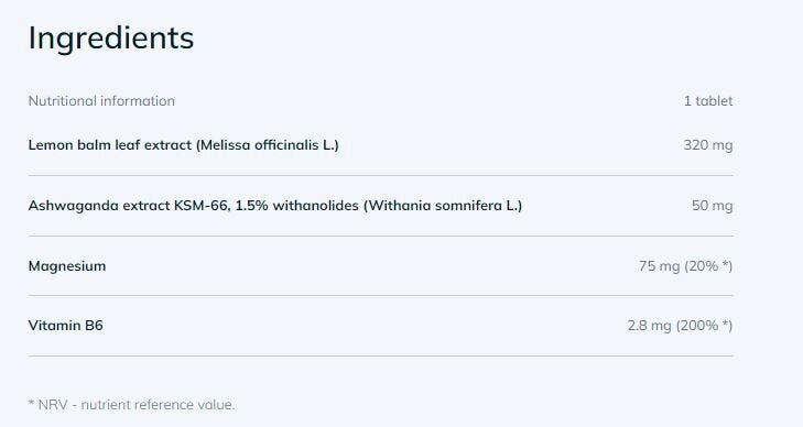 Ingrediencie: malát horečnatý, extrakt z medovky lekárskej (Melissa officinalis l.); mikrokryštalická celulóza (plnivo); extrakt z ashwagandhy (Withania somnifera L.); polyvinylalkohol, polyetylénglykol, mastenec (leštidlá); zosieťovaná sodná soľ karboxymetylcelulózy (plnivo); stearan horečnatý, oxid kremičitý (protihrudkujúce látky); pyridoxín hydrochlorid (vitamín B6); oxid titaničitý, brilantná modrá FCF, oxid železitý (farbivá).