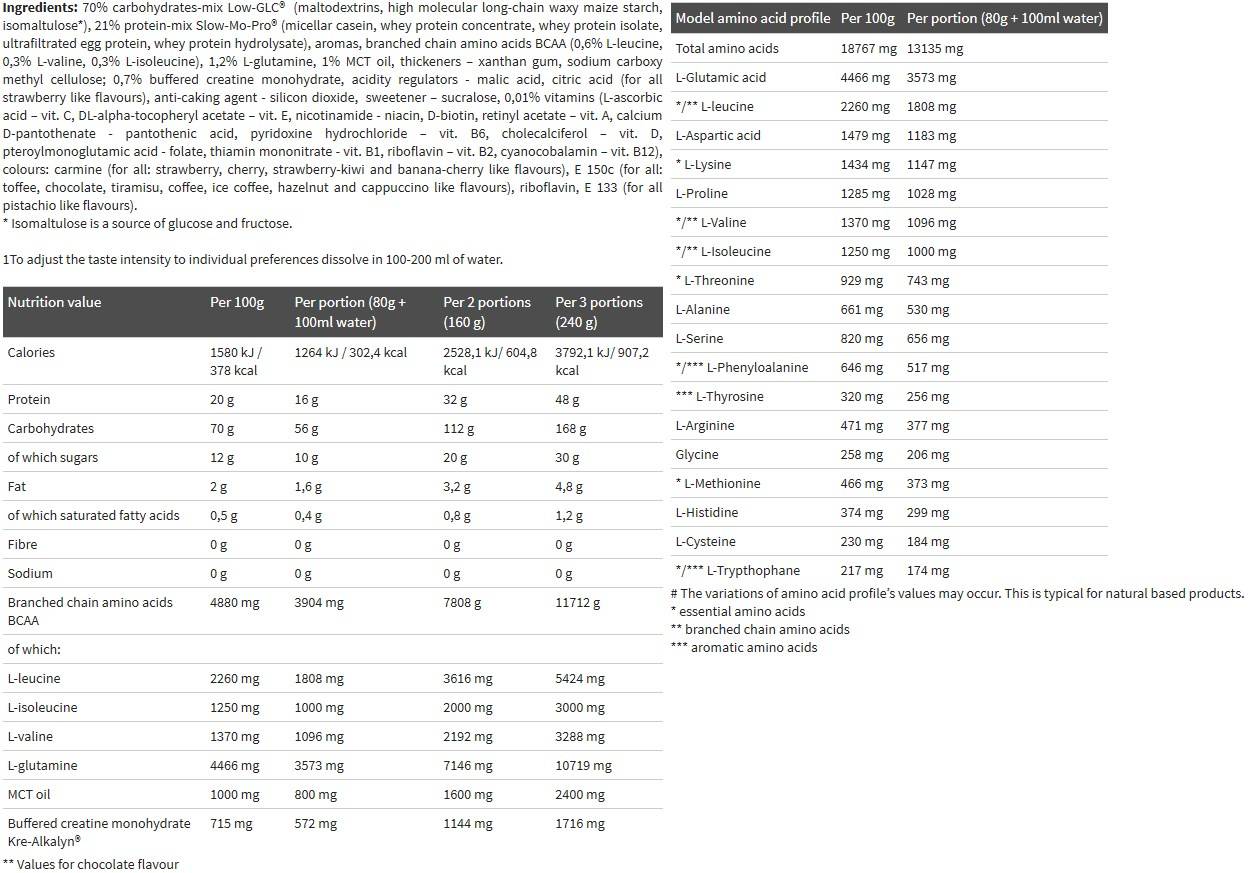 Rozšírené zloženie starostlivo vybrané sacharidy - Low GLC™ s pridaným kompletné živočíšne bielkoviny - Slow-Mo-Pro™ , ktorých synergické pôsobenie spôsobí výbuch vo svaloch v dôsledku nasýtenia živinami.