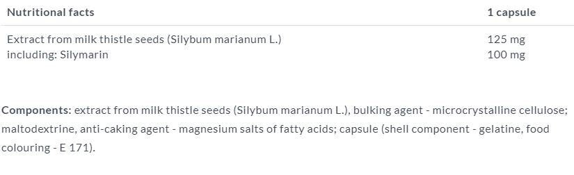 Ingrediencie: 60,5% extrakt zo semien ostropestreca mariánskeho, plnidlo - mikrokryštalická celulóza, protihrudkujúca látka - stearan horečnatý, kapsula (želatína, farbivo E171).