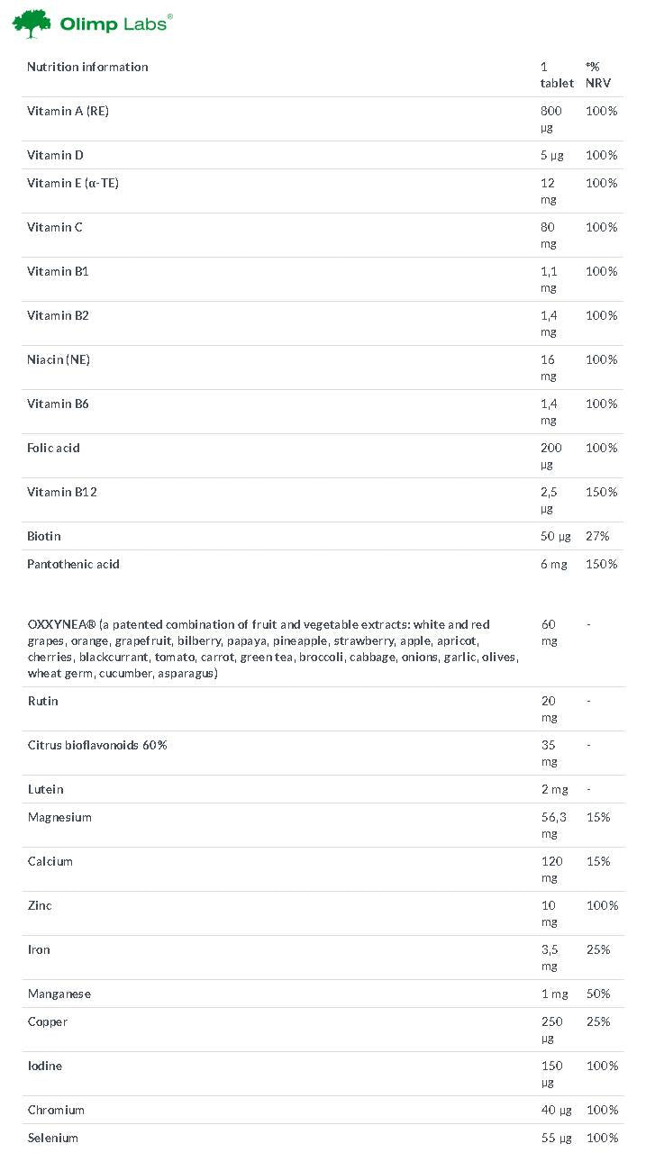 To uľahčuje doplnenie základných potrieb mikroživín v tele. Ďalej obsahuje luteín, rutín, citrusové bioflavonoidy a OXXYNEA ® , patentovanú zmes 22 extraktov z ovocia a zeleniny.