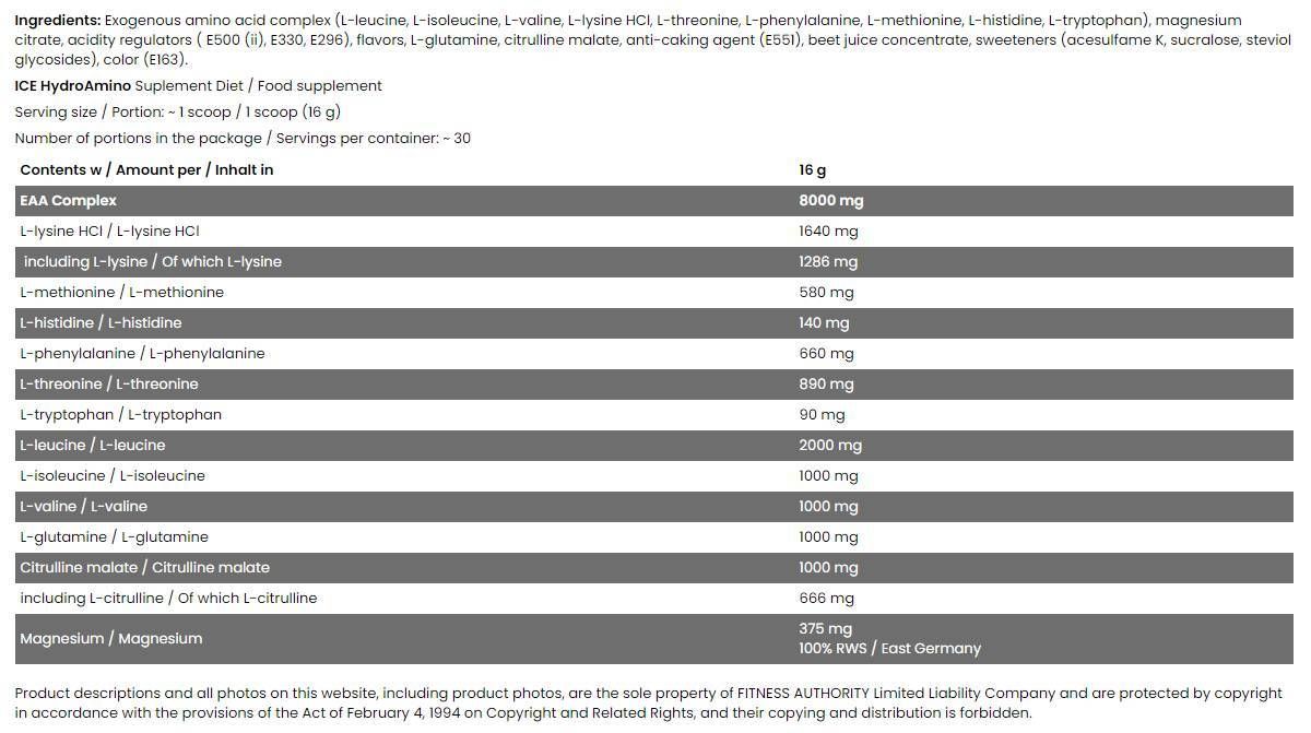 Fa Hydro Amino / Ice Series je skvelý, komplexný doplnok výživy, ktorý kombinuje vysoké dávky BCAA s esenciálnymi aminokyselinami. Produkt je vhodný pre všetkých športovcov, ktorí chcú zlepšiť svoju regeneráciu a tonus, ako aj podporu procesy budovania svalov v ich tele.