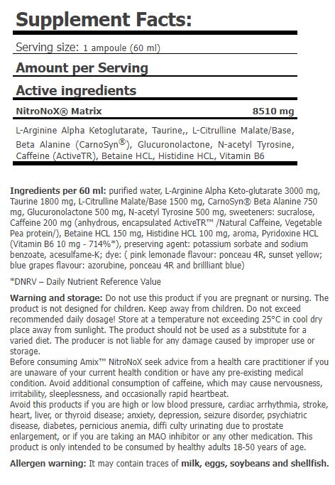 AMIX Nitro Nox ® Shot / 60 ml je inovatívny doplnok výživy, ktorý ponúka silnú podporu pre vaše tréningové ciele. Prípravok svojim optimalizovaným obsahom pomáha výrazne zvyšovať energiu a vytrvalosť, ktorá je nevyhnutná pre kvalitnú fyzickú námahu. Tento vzorec obsahuje zložky, ktoré zlepšujú prietok krvi a potrebné živiny do svalov, čo vám umožní dosiahnuť maximálne výsledky.