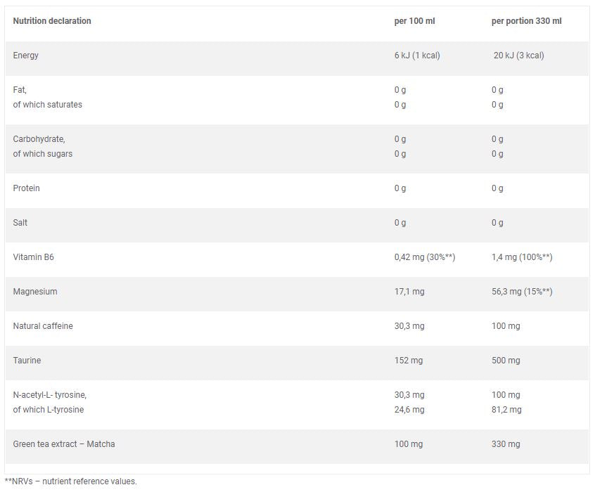 Ingrediencie: Vitamín B6, horčík, kofeín, taurín, L-tyrozín, extrakt zo zeleného čaju Matcha